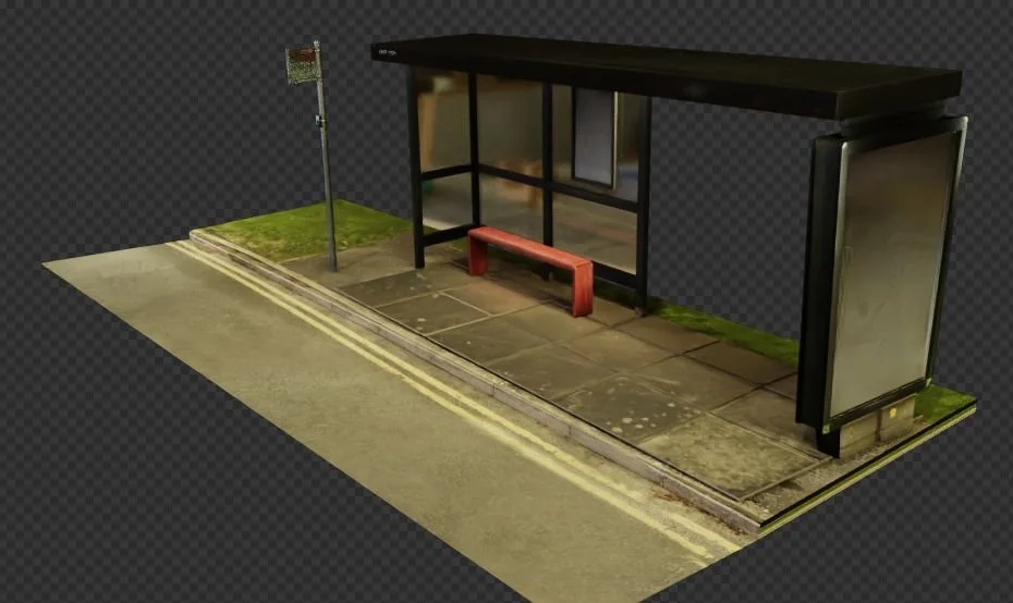 This realistic bus stop was made by combining photogrammetry ( for the road and terrain) with photomodelling.