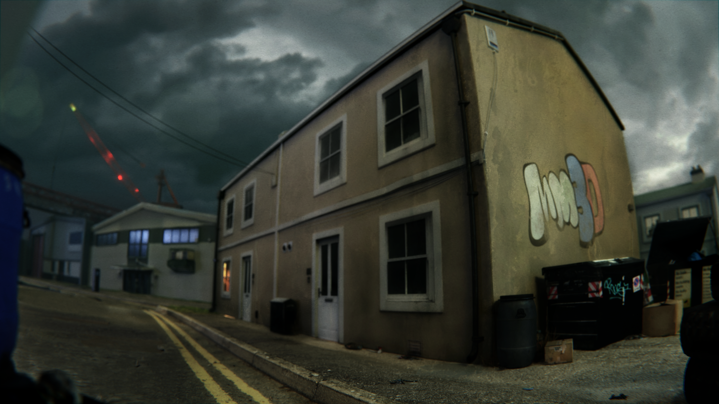 In the image above, additional grime was added in Photoshop post-production, but the overall texture of the building is exactly as it is in the real-life photograph. Turning the photo into a model allows for completely different lighting and scenic developments to be created in 3D.